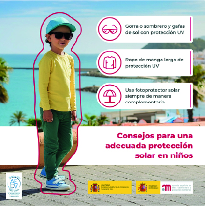 Consejos para una adecuada protección solar en niños La campaña desarrollada por AEMPS junto al Ministerio de Derechos Sociales, Consumo y Agenda 2030, aporta una serie de recomendaciones para proteger el área ocular de la radiación solar mediante el uso de gafas adecuadas. En la campaña también participa la Fundación Piel Sana de la Academia Española de Dermatología y Venereología (AEDV), entidad que fomenta el estudio de la piel y sus enfermedades. Fecha publicación: 02/07/2024 | ![]() |